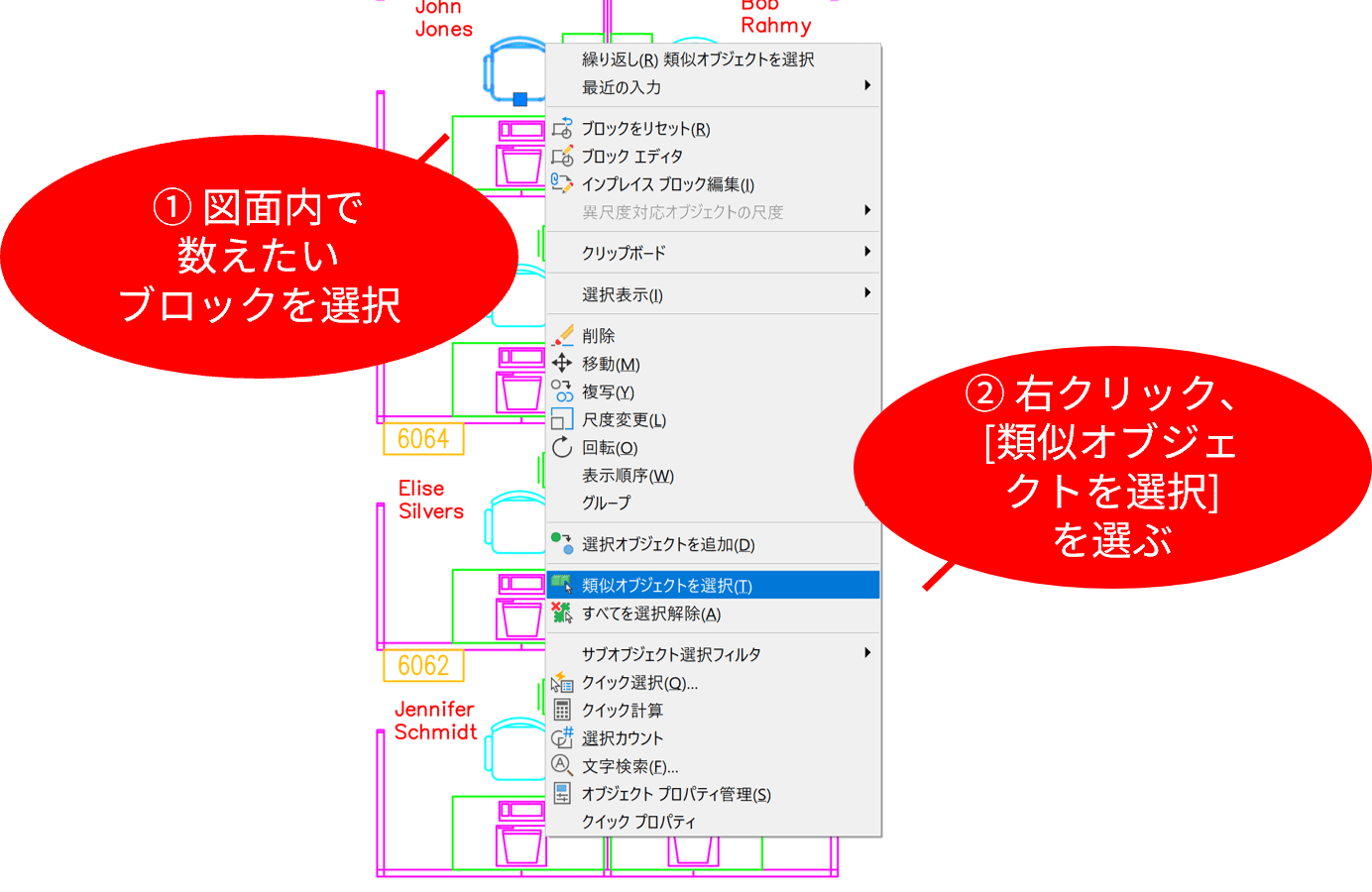 AutoCAD には、ブロックやオブジェクトを効率的に数えるための複数の方法が用意されています。ひとつ目は、[類似オブジェクトを選択]コマンドを使用する方法です。このコマンドには複数のアクセス手段がありますが、最も簡単なのは、図面内で数えたいブロックを選択し、右クリックして、コンテキスト メニューから[類似オブジェクトを選択]を選ぶことです。