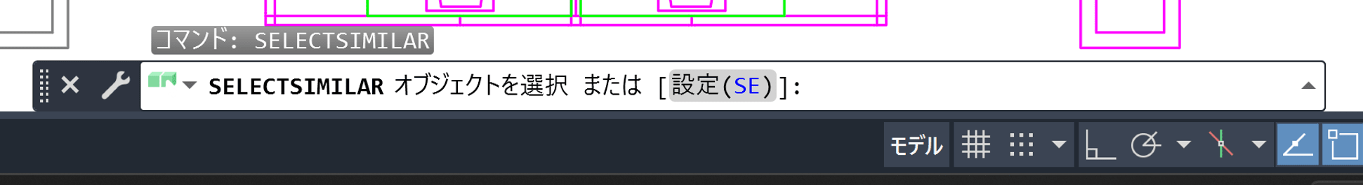 この方法は、既定の設定で「類似」オブジェクトを選択します。選択対象をコントロールするには、コマンド ライン ウィンドウに SELECTSIMILAR と入力します。コマンド ラインに[設定(SE)]オプションが表示されます。
