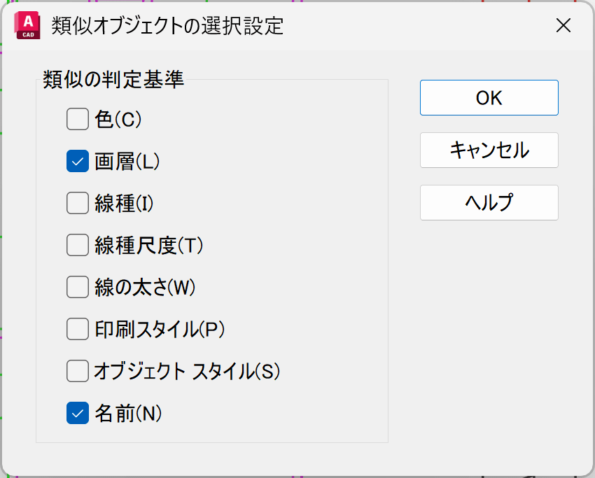 注:[名前]にチェックを付けると、名前が一致する参照オブジェクト(ブロック、外部参照、イメージなど)を類似オブジェクトとみなします。また、同じタイプの名前のないオブジェクト(線分や円など)も類似オブジェクトとみなします。
