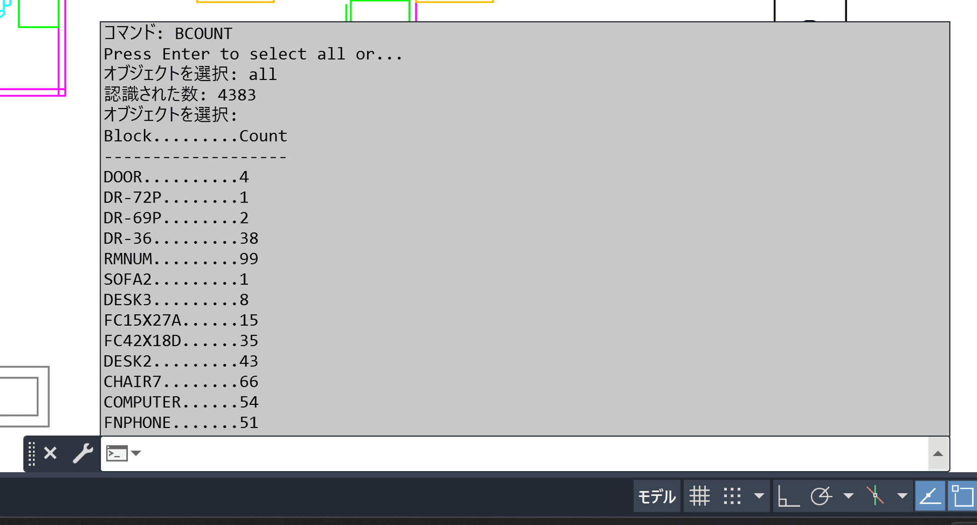 図面内のブロックを数えるもうひとつの簡単な方法は、BCOUNT コマンドを使用することです。このコマンドを使用する最良の方法は、コマンド ラインに入力し、プロンプト「オブジェクトを選択:」に対して ALL と入力することです。[F2]ファンクション キーを押してコマンド ライン ウィンドウを開き、テキストを選択・コピーして他のアプリケーションに貼り付けることもできます。