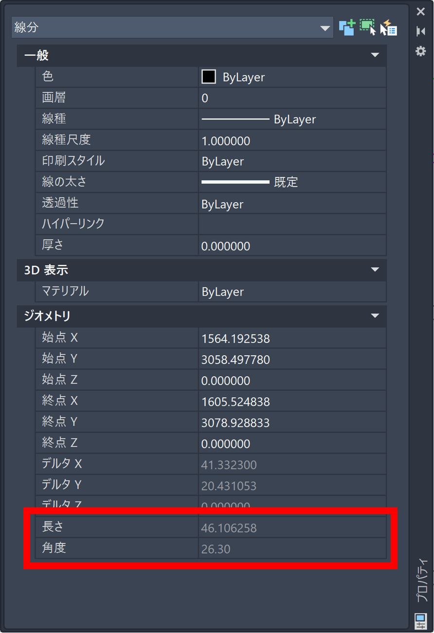 プロパティ パレットを使用すると、オブジェクトの長さ、面積、角度をすばやく簡単に取得できます。たとえば、オブジェクトの長さと角度を確認したい場合は、オブジェクトを選択してプロパティ パレットを表示するだけです。