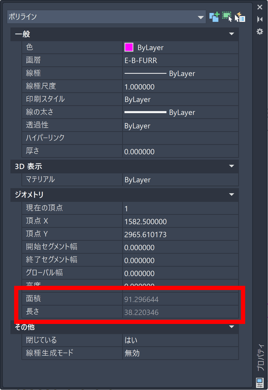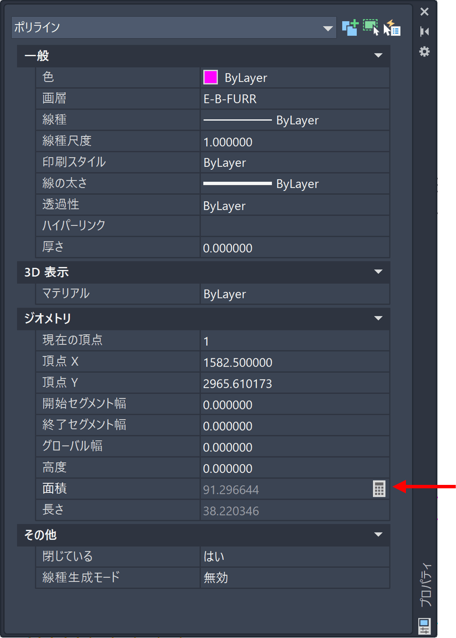 オブジェクトの面積を表示したい場合は、面積プロパティを持つオブジェクト(ポリライン、円など)である必要があります。