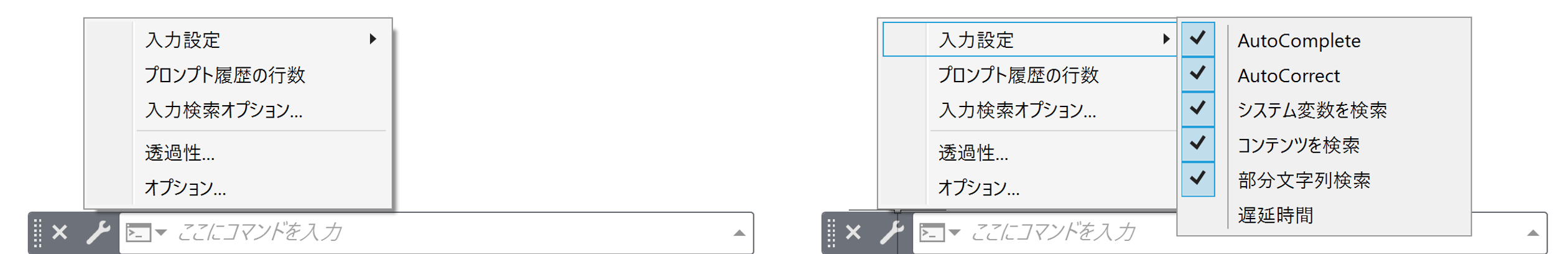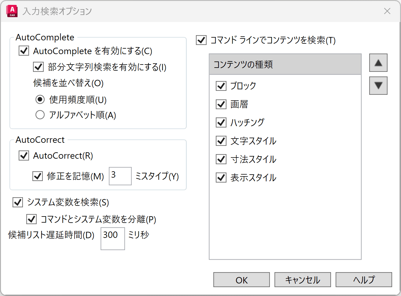 最後の項目[遅延時間]は、チェック マークのオン/オフを切り替えるものではありません。クリックすると、システム変数 INPUTSEARCHDELAY が表示され、コマンド ラインの入力候補リストが表示されるまでの遅延時間をミリ秒数単位で設定できます。既定値は300ミリ秒です。100~10,000ミリ秒の範囲で値を設定できます。一般的には、既定の300で問題ありません。