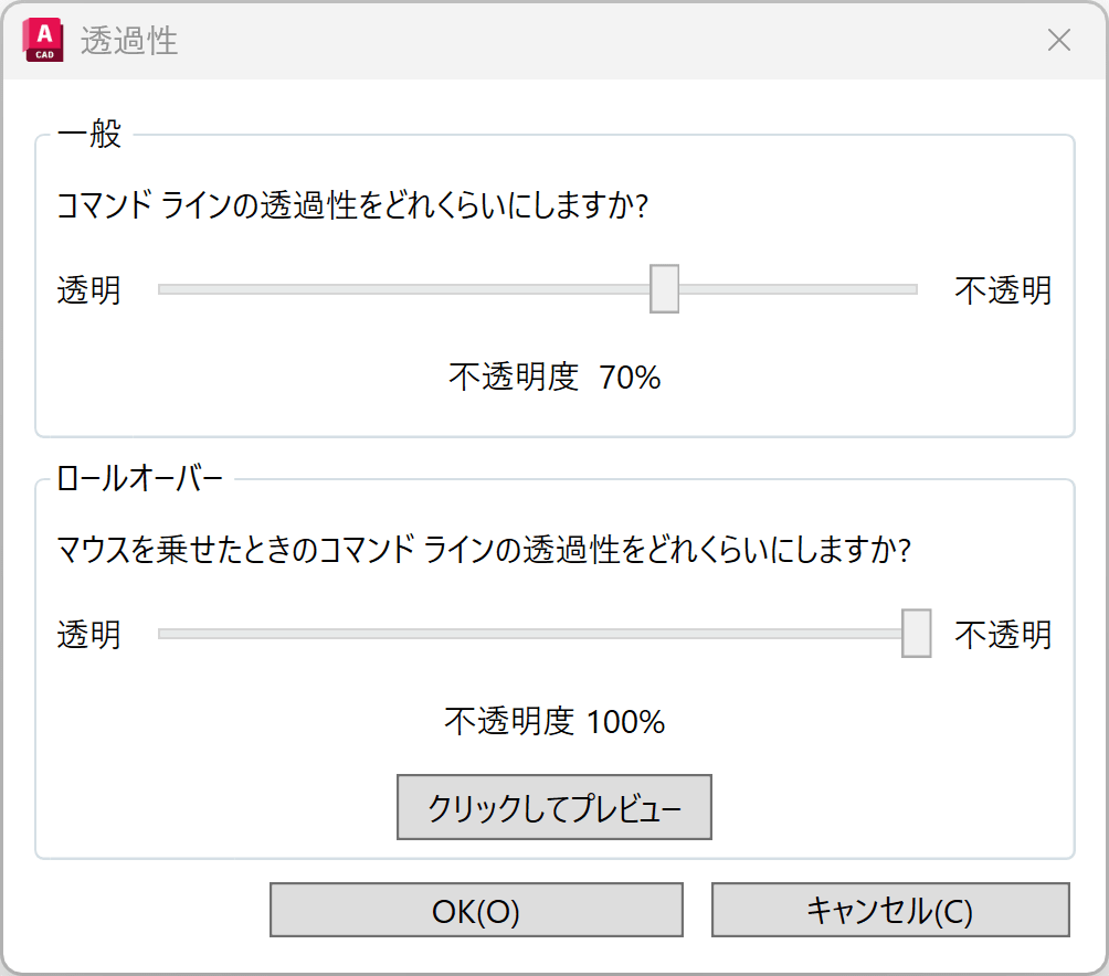 その次の項目は、[透過性...]です。ここでは、一般的な設定(既定は70%)と、マウスを乗せたときの透過性を調整できます。既定は100%です。[クリックしてプレビュー]ボタンを使って確認できます。