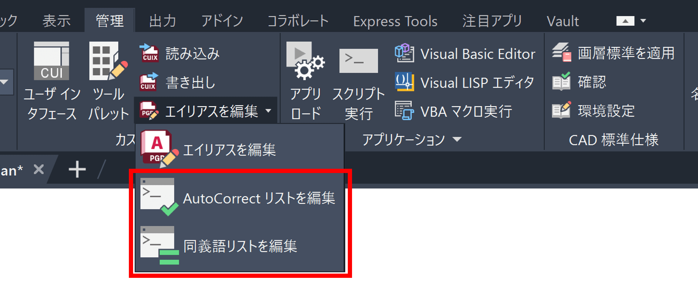 AutoCorrect ファイルと同義語ファイルは、どちらも手動で編集できます。リボンの[管理]タブで、[エイリアスを編集]プルダウンをクリックすると、これらのツールが見つかります。