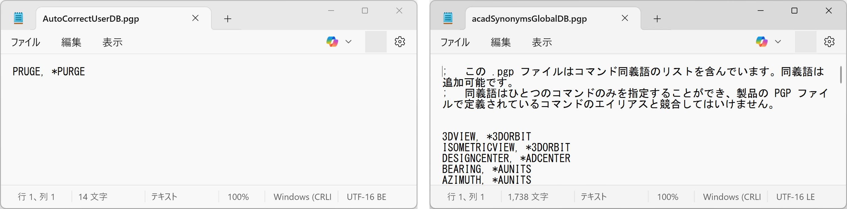 AutoCAD は必要に応じてこれらのファイルを編集しますが、ユーザーは自由に項目を追加・削除することができます。下の左の画像では、AutoCorrect リストが PRUGE のスペルミスを検出していることが分かります。右の画像の同義語リストには、項目が追加される前の既定のメッセージが表示されています。