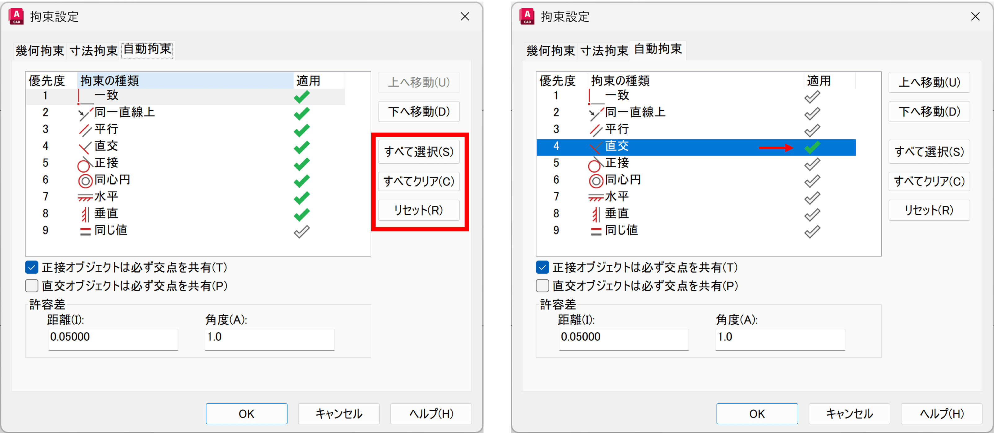 既定では、[同じ値]以外のすべての拘束が有効になっています。今回の長方形には、[直交]のみを適用するのが適切です。[すべてクリア]ボタンをクリックし、[直交]のみにチェックを入れます。[OK]をクリックしてダイアログ ボックスを閉じると、準備完了です。