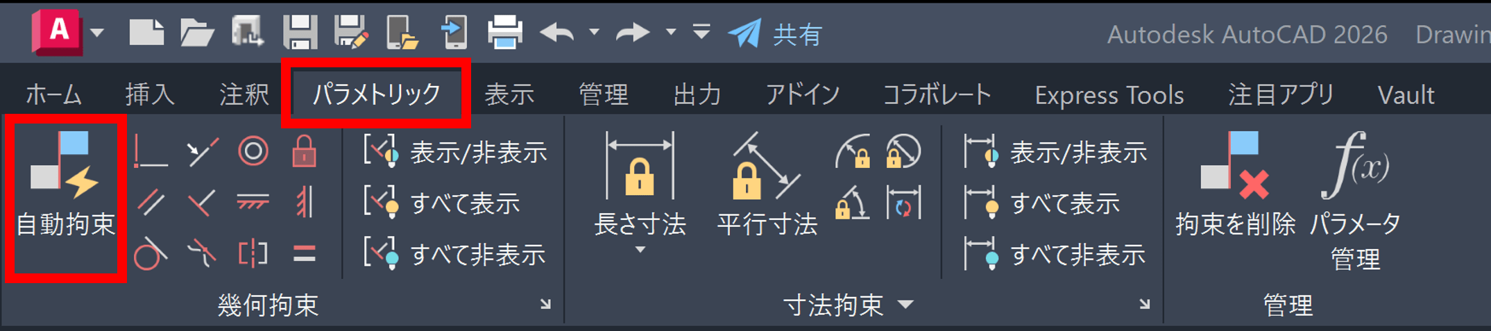 答えは幾何拘束にあります。リボンの[パラメトリック]タブから作業を始めましょう。アイコンが多く並んでおり、あまり使ったことがない方も多いかもしれません。