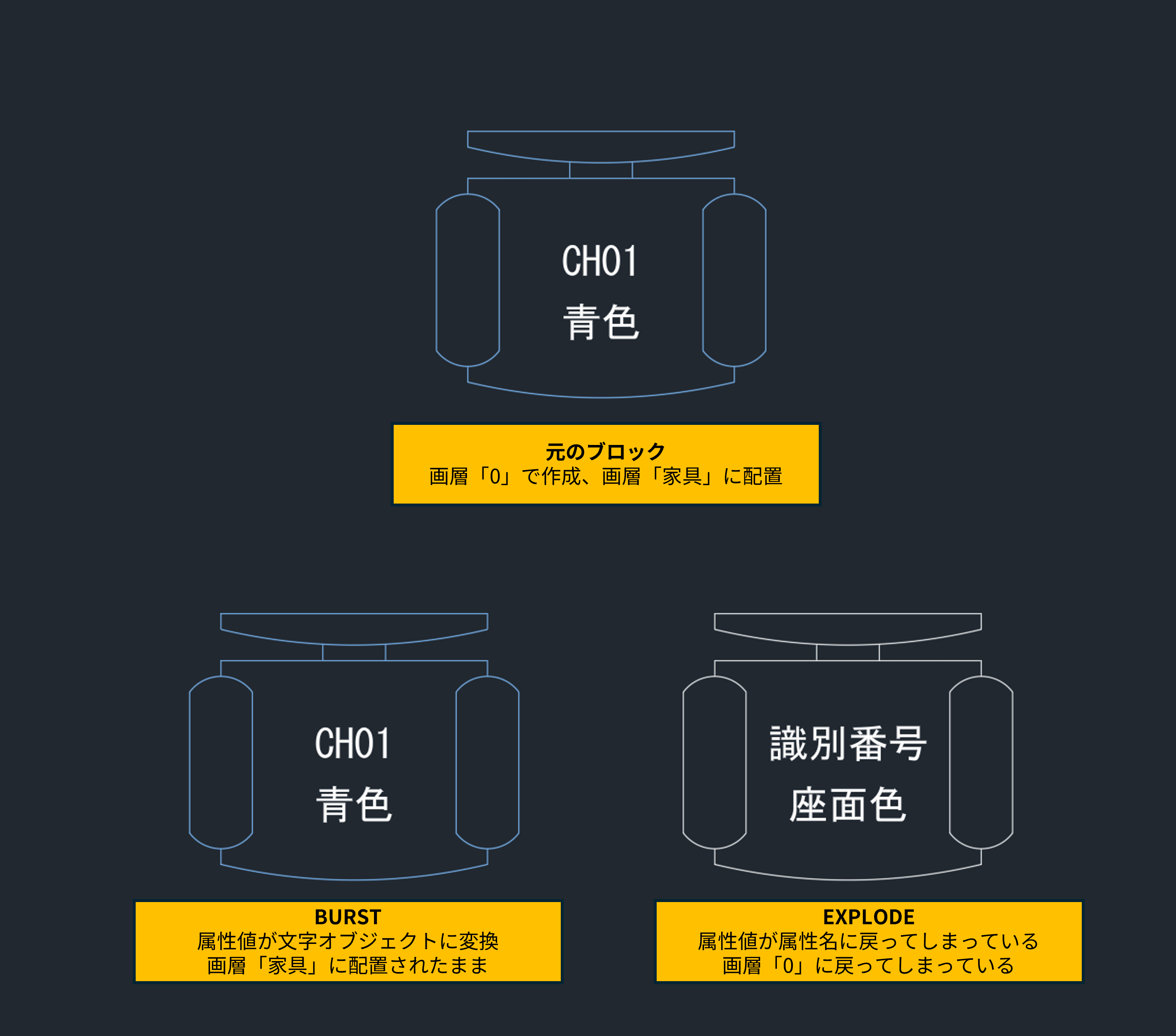ブロックに対してEXPLODE[分解]コマンドを使用する(右下)と、EXPLODE[分解]コマンドがプロセス中に属性を既定値に戻し、画層もブロックが作成された画層に戻していることが分かります。
