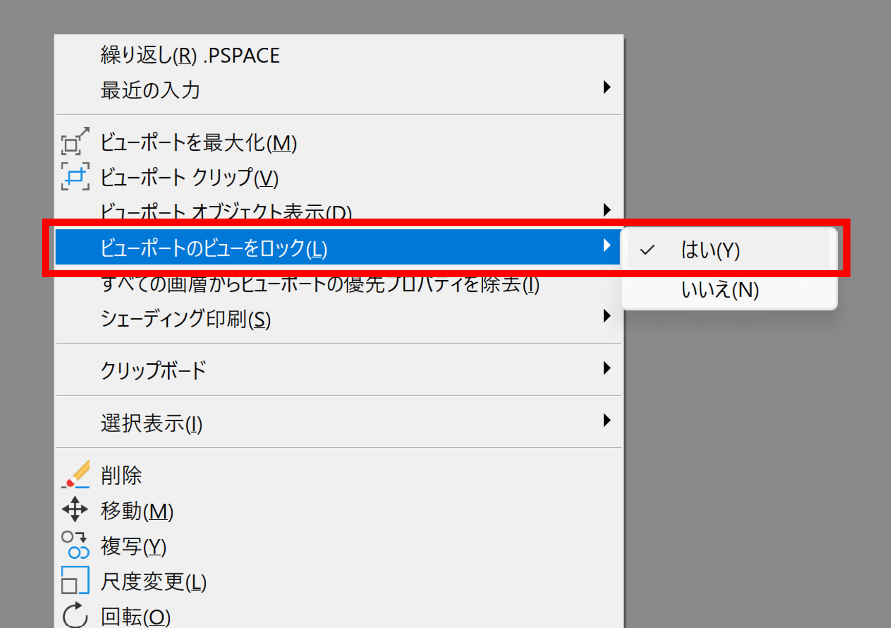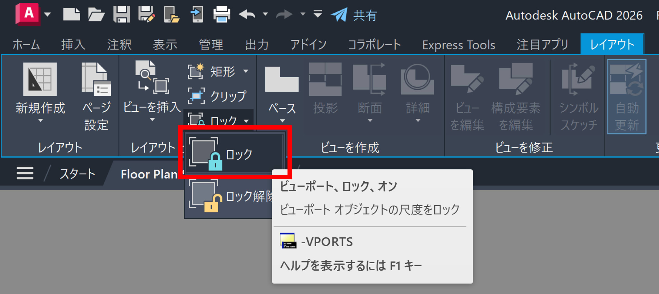 レイアウト空間でビューポートを作成、尺度調整、位置合わせしたら、必ず、ロックしましょう。ロックする方法は4つあります。