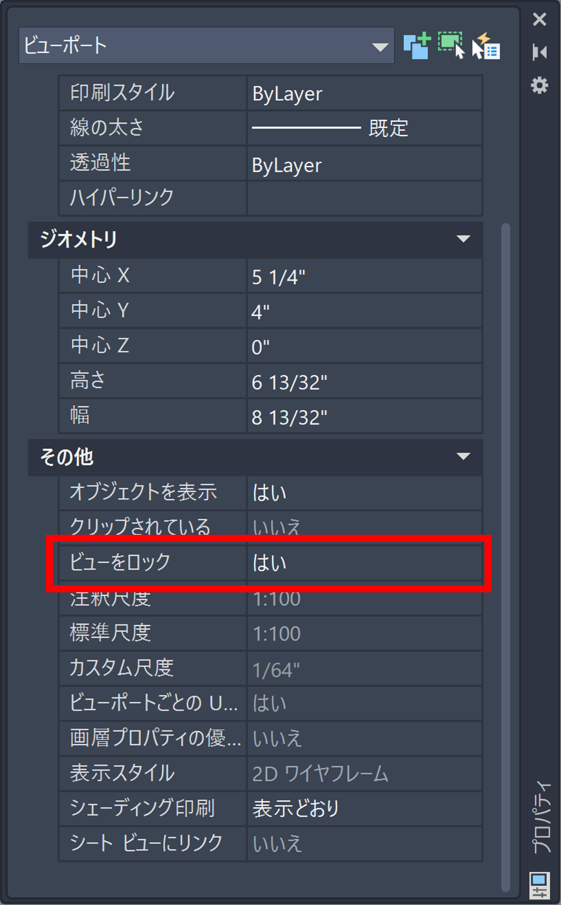 方法3:[プロパティ]パレットをよく使われる方の場合は、ビューポートを選択したら、[プロパティ]パレットの[その他]領域で[ビューをロック]を見つけて、[はい]を選択します。