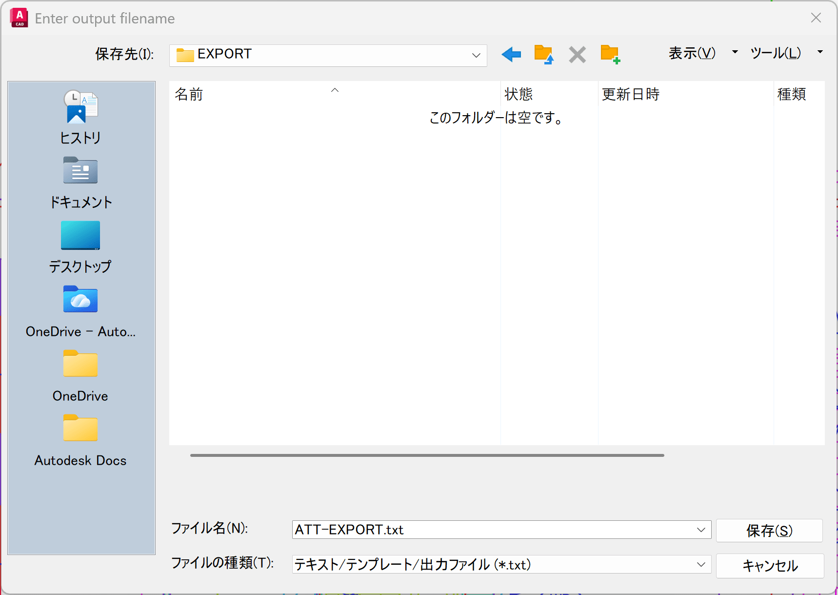 開始するには、ATTOUT[Export Attributes]コマンドをクリックするか、コマンド ラインに ATTOUT と入力します。起動したら、ダイアログ ボックスを使用して出力ファイルの保存場所を指定し、ファイル名を入力します。下の例では「ATT-EXPORT.txt」という名前で保存しています。