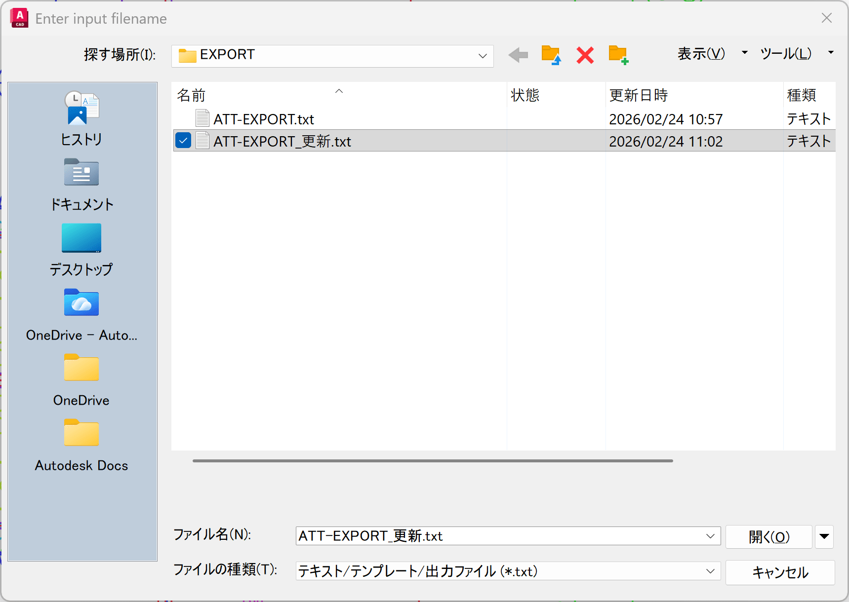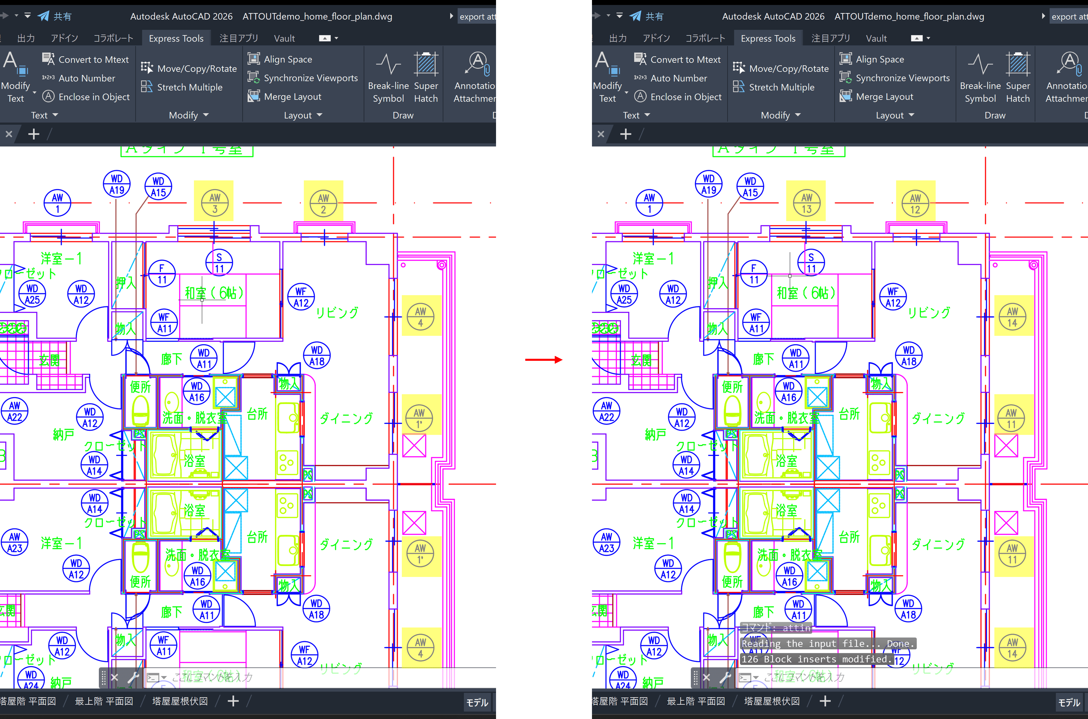 更新されたファイルを選択して読み込むと、.txt で変更された属性がすべて図面内で自動的に更新されます。