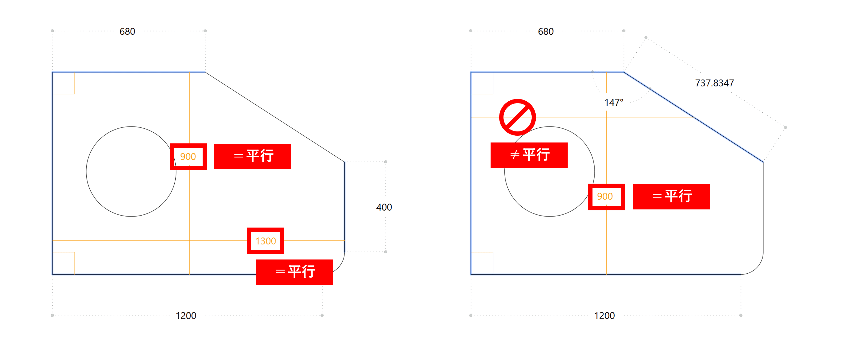 さらに便利な視覚的フィードバックも用意されています。接合した2本の線が直角に交わっている場合は、角に小さなオレンジ色の四角形が表示され、90度であることを示してくれます。「見た目は直角だけど、実際には 89.9998度だった」といった微妙なずれを見逃さずに済みます。