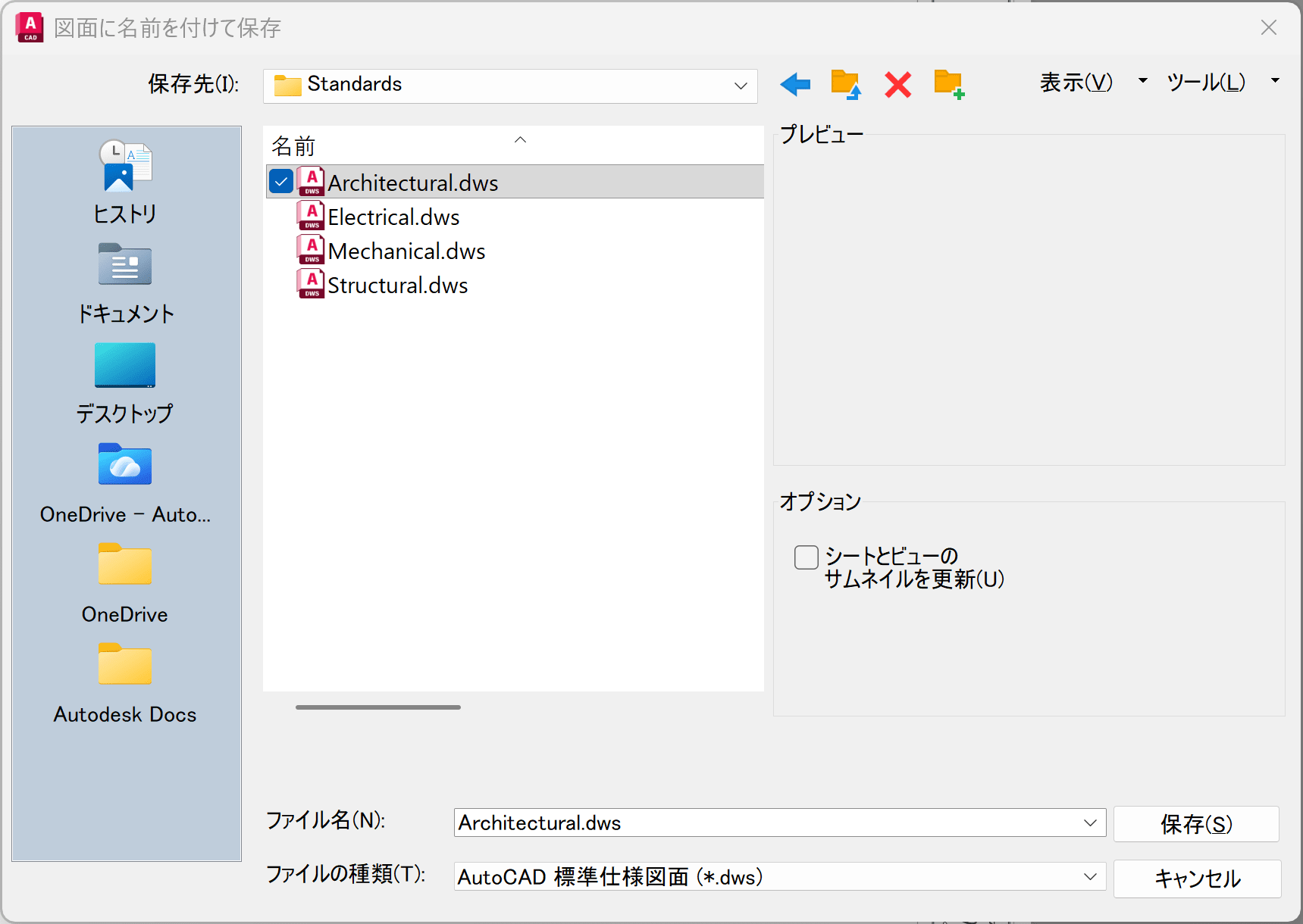 まず、標準仕様としたい画層、線種、寸法・文字スタイル、マルチ引き出し線スタイルを使用して図面を作成します。その図面を、標準仕様ファイル(DWS)として保存します。
