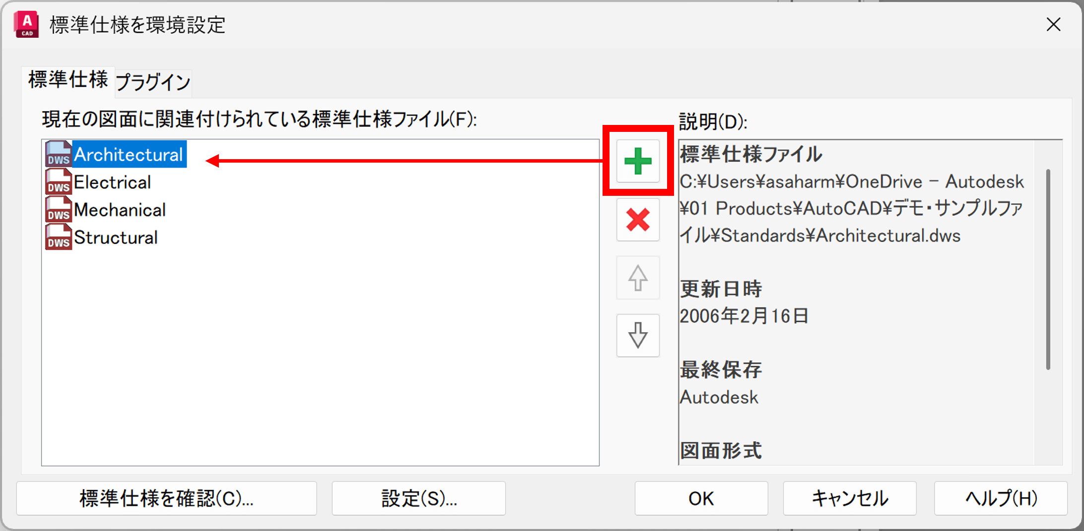 標準仕様ファイルを作成したら、リボンの[管理]タブを開き、[CAD 標準仕様]パネルから[環境設定]を選択します。これにより、[標準仕様を環境設定]ダイアログ ボックスが表示され、作成した DWS ファイルを図面に関連付けることができます。