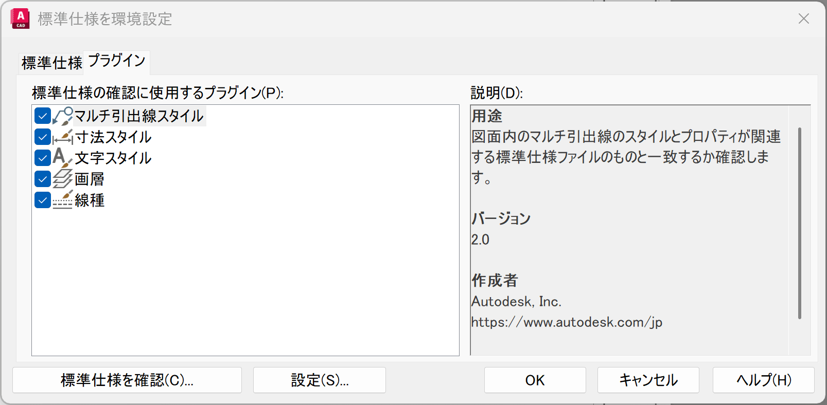 次に、[プラグイン]タブで、図面を監査するときに使用するプラグイン(画層、線種、寸法・文字スタイル、マルチ引き出し線スタイル)を選択します。必要に応じてチェックをオンまたはオフにします。説明ボックスには、各プラグインが監査する内容が表示されます。