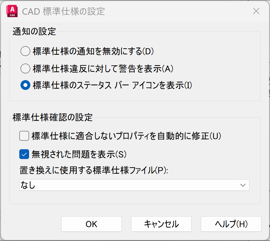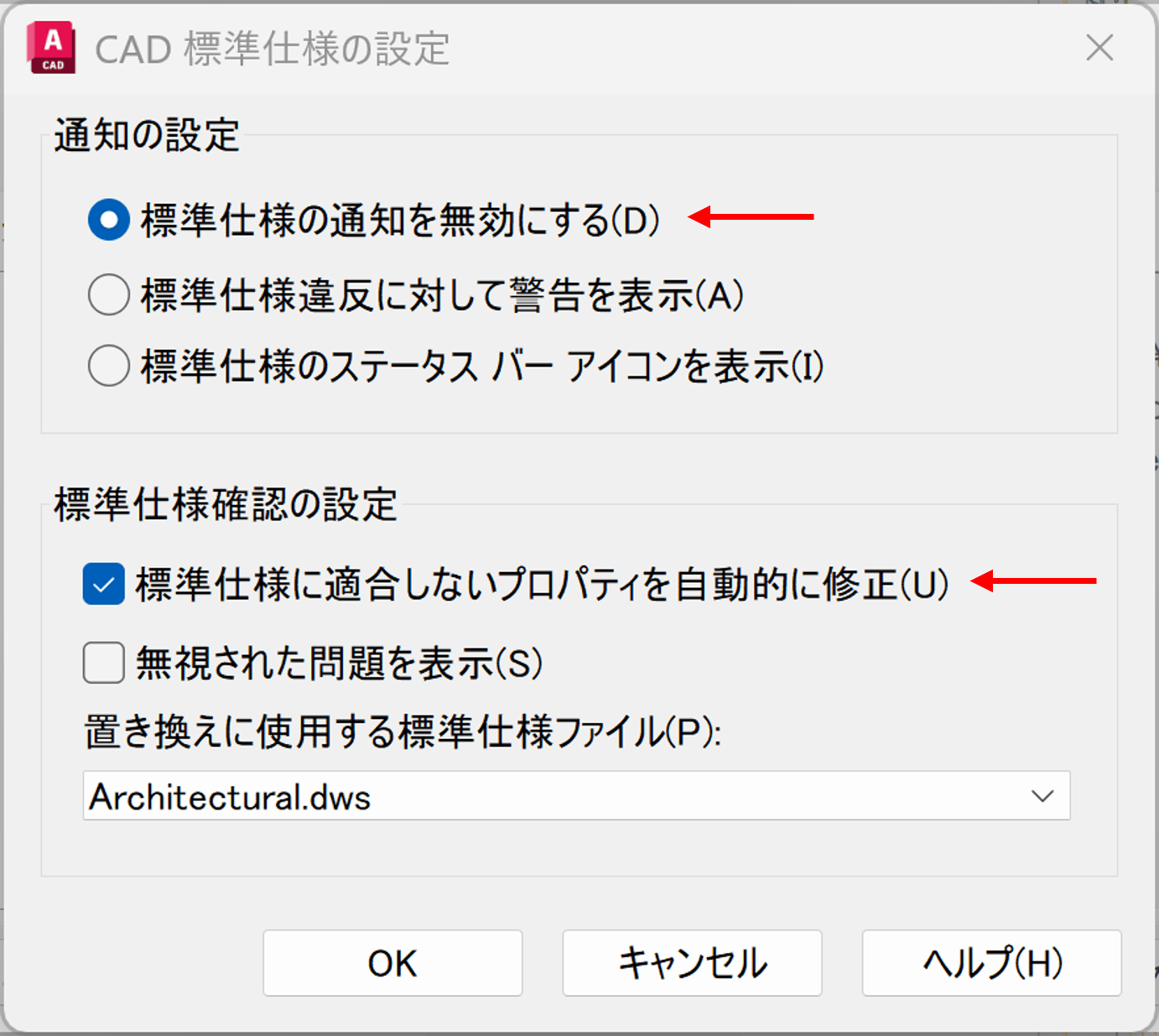 会社で使用しているテンプレートの DWT ファイルを複製し、拡張子を DWS に変更して、各竣工図に適用してみてください。非標準プロパティを自動的に修正し、通知を無効にするように設定すれば、あっという間に作業の 90% 以上が完了します。