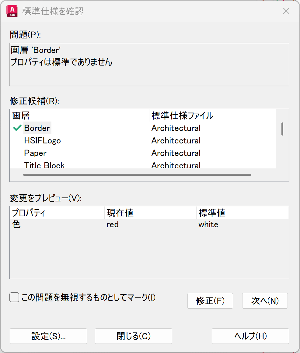 [標準仕様を確認]ダイアログ ボックスには、検出された問題が一覧表示され、関連付けられた DWS ファイルに基づいて修正方法が提案されます。問題を修正する、無視する、または次の問題へスキップするといった操作が可能です。