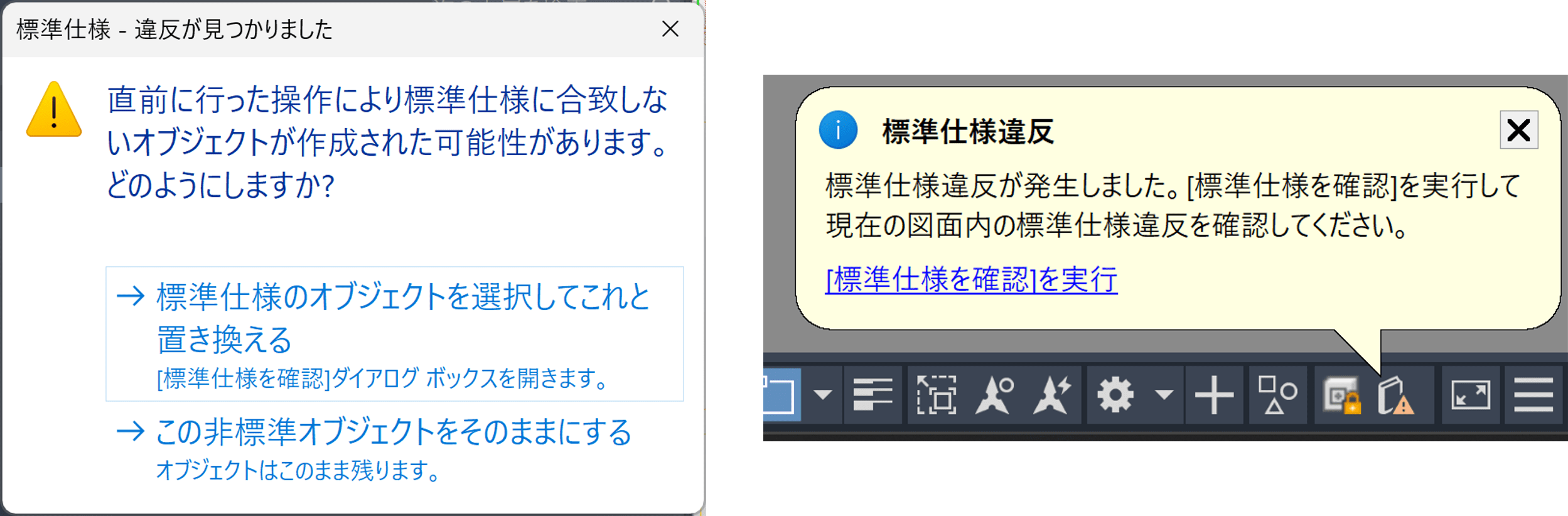 通知が有効になっている場合、監査の実行中や DWS ファイルが関連付けられた図面を開いた際に、違反が検出されると、警告メッセージまたはステータス バー バルーンが表示されます。