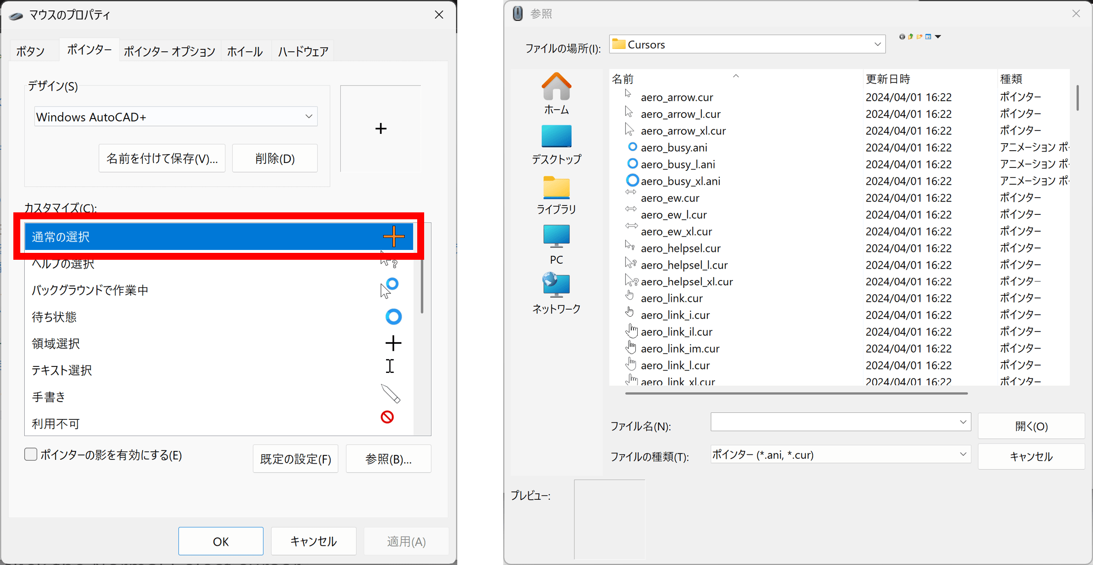 - ポインターを変更:[通常の選択]をダブルクリックし、表示された[参照]ダイアログ ボックスから[cross_il.cur]を選択→[開く]→[OK]→[はい]の順に進みます。