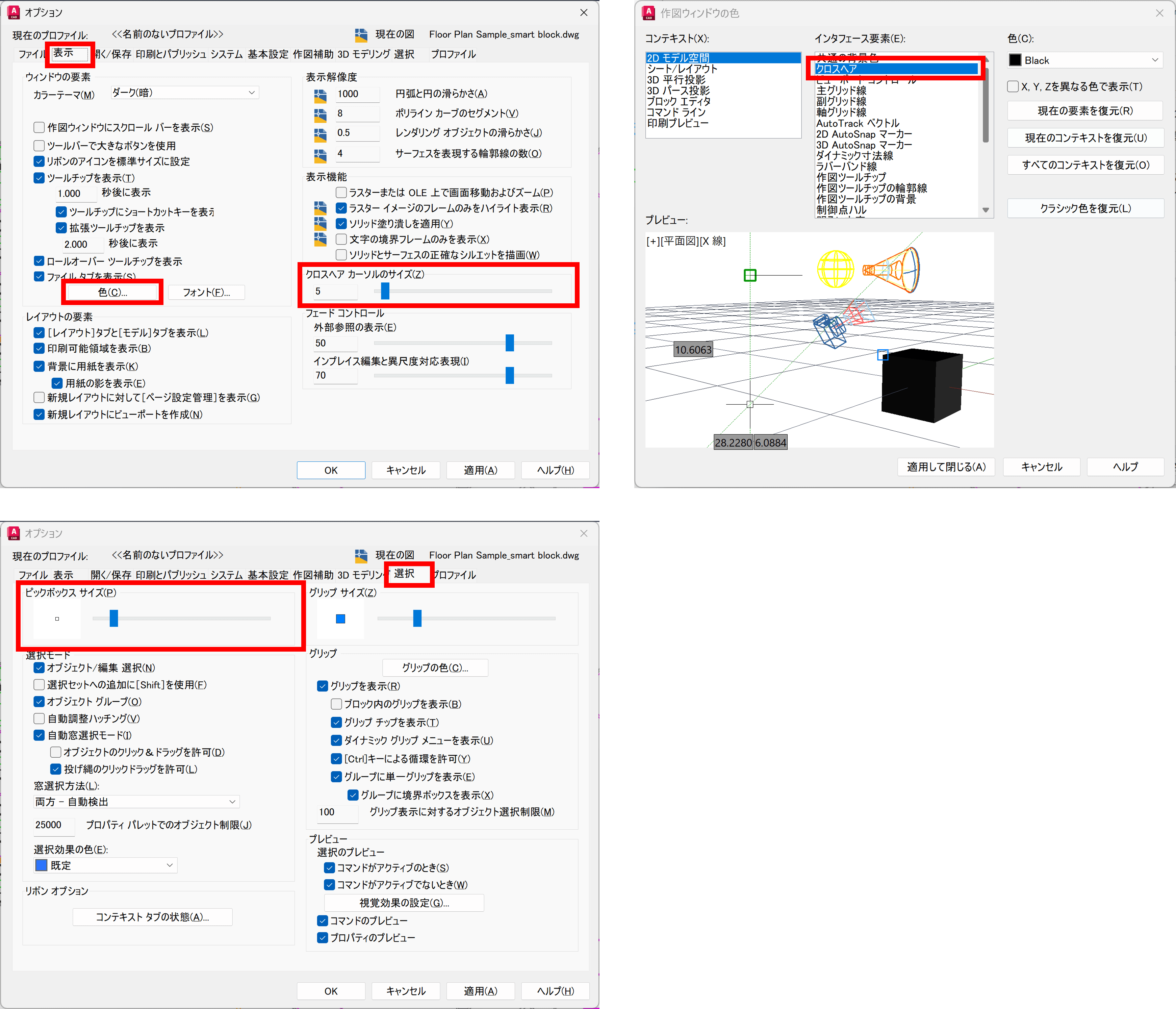 クロスヘア カーソルのサイズの変更は[表示]タブから、色の変更は[色(C)]ボタンから[作図ウィンドウの色]ダイアログ ボックスで設定できます。また、ピックボックスのサイズは[選択]タブから調整可能です。