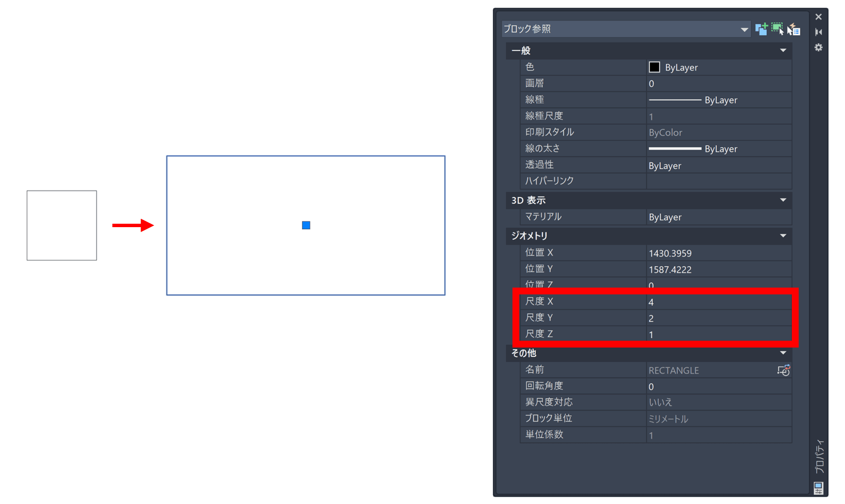 作業が完了したらブロックを分解することで、異なる X および Y 係数でのオブジェクトの拡大縮小できました。