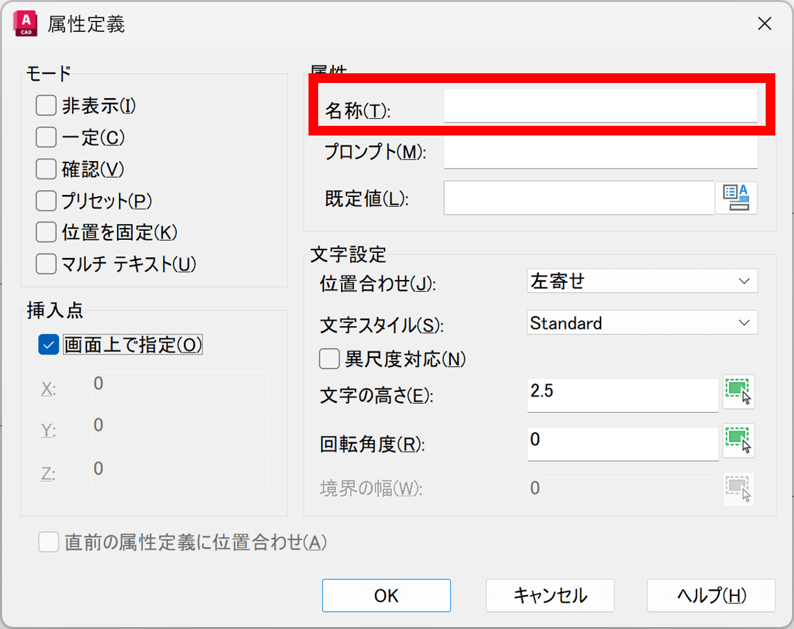 ATTDEF には、指定可能なモードや設定が多数あります。[名称]は属性を識別するための名前で、スペースを含まない文字列を使用し、大文字で指定する必要があります。ただし、小文字で入力しても、AutoCAD が自動的に大文字へ変換してくれます。