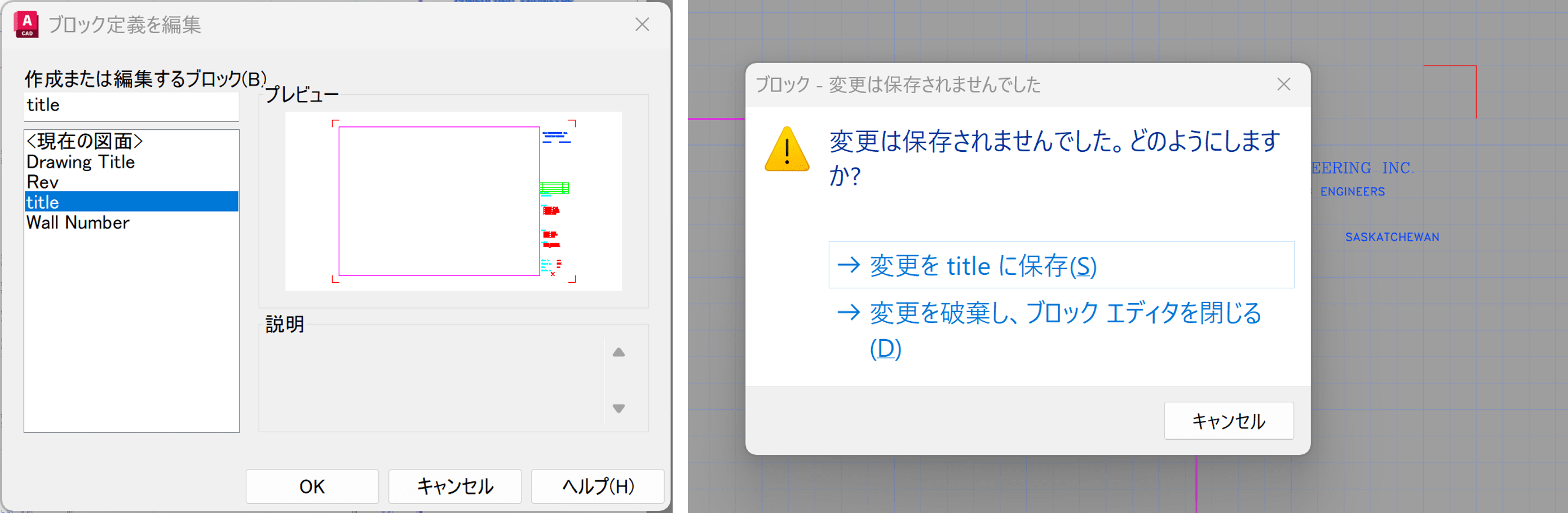 もしくは、まず図面内でブロックを選択してから[ブロック定義を編集]ダイアログ ボックスを呼び出すと、事前にそのブロックが選択されるため、探し出す必要がありません。
