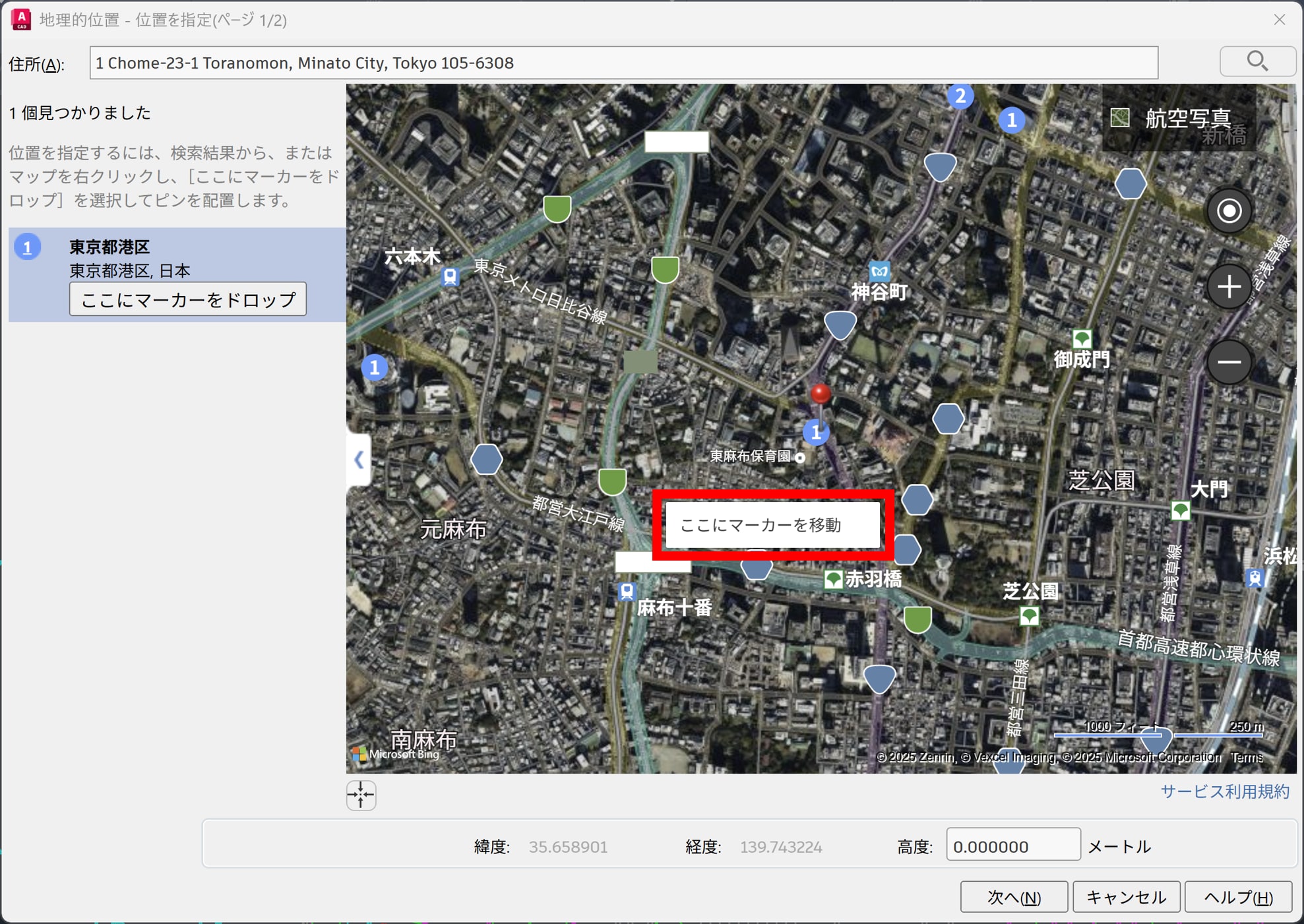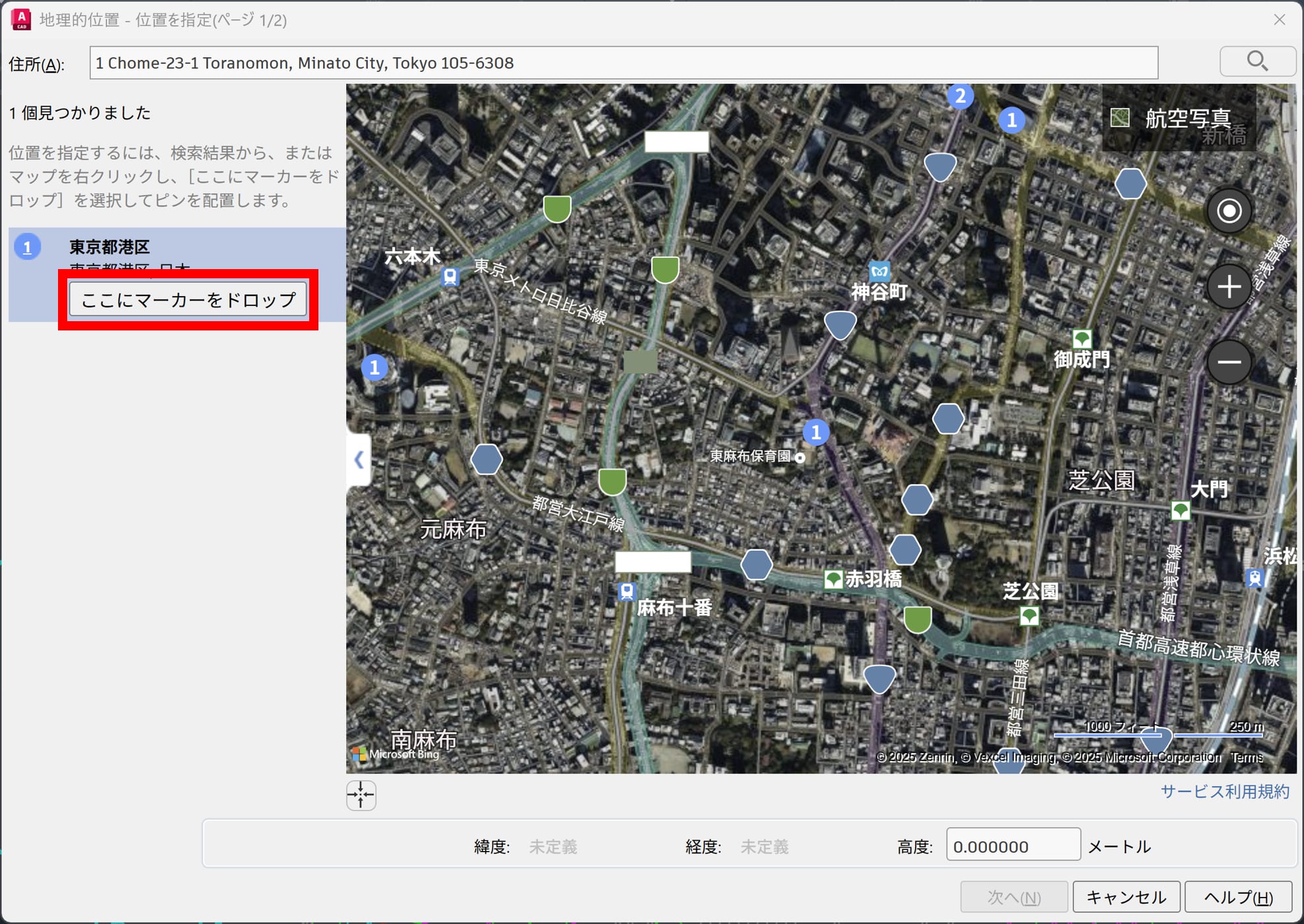 使用したい場所が見つかったら、[ここにマーカーをドロップ]をクリックします。AutoCAD が地図上にピンを配置し、緯度と経度が自動的に適用されます。特定の高度を設定することもできます。