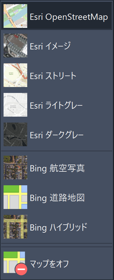 注:AutoCAD 2025の新機能として、Bing Mapの他に、5つの新しいEsri Map を使用して、図面ファイルに地理的位置情報を割り当てることができるようになりました。