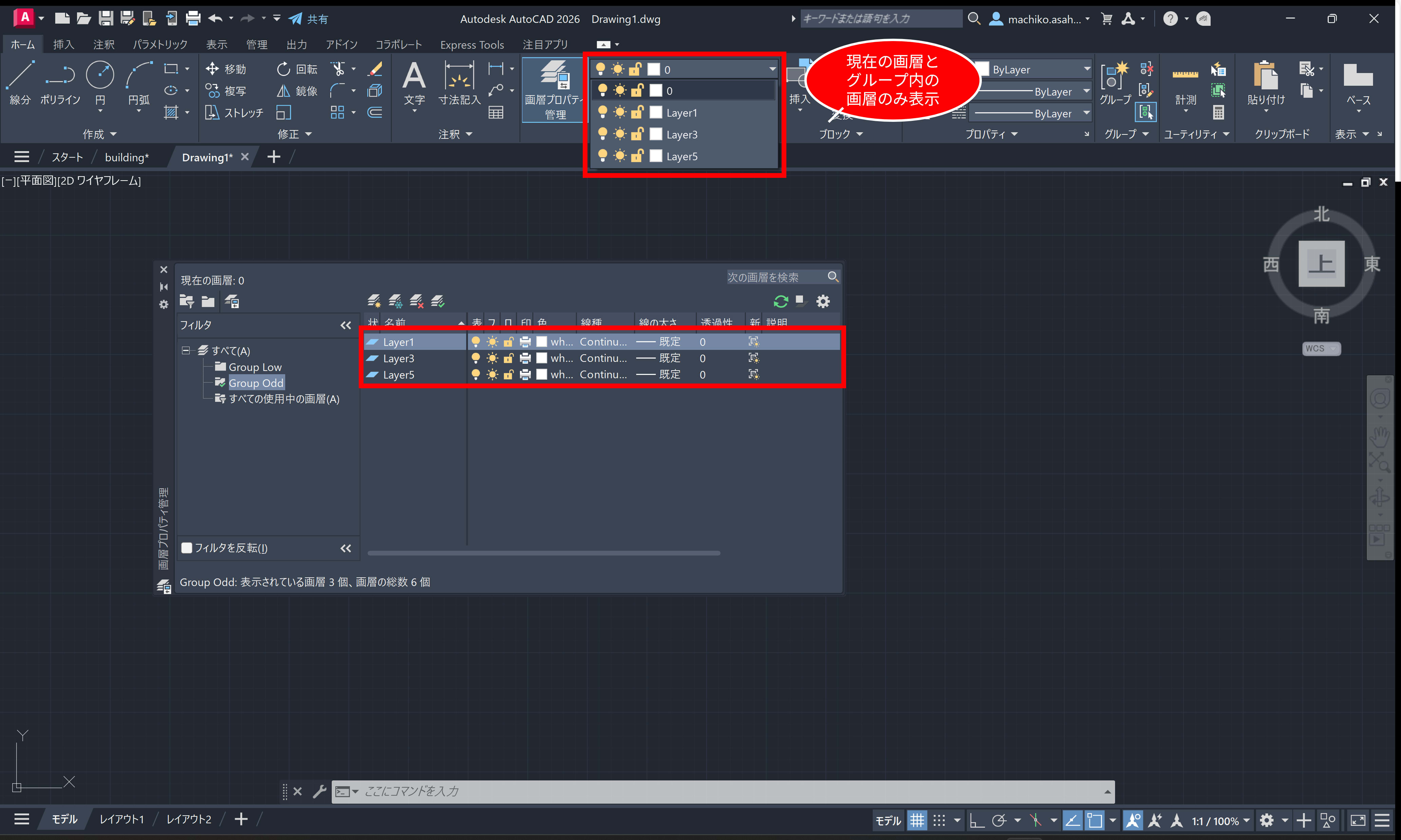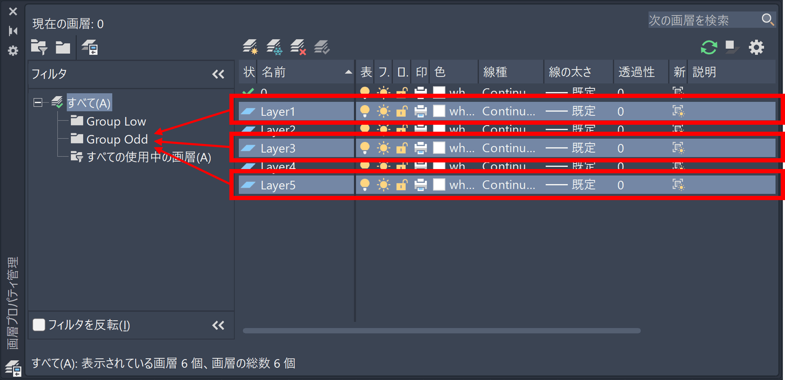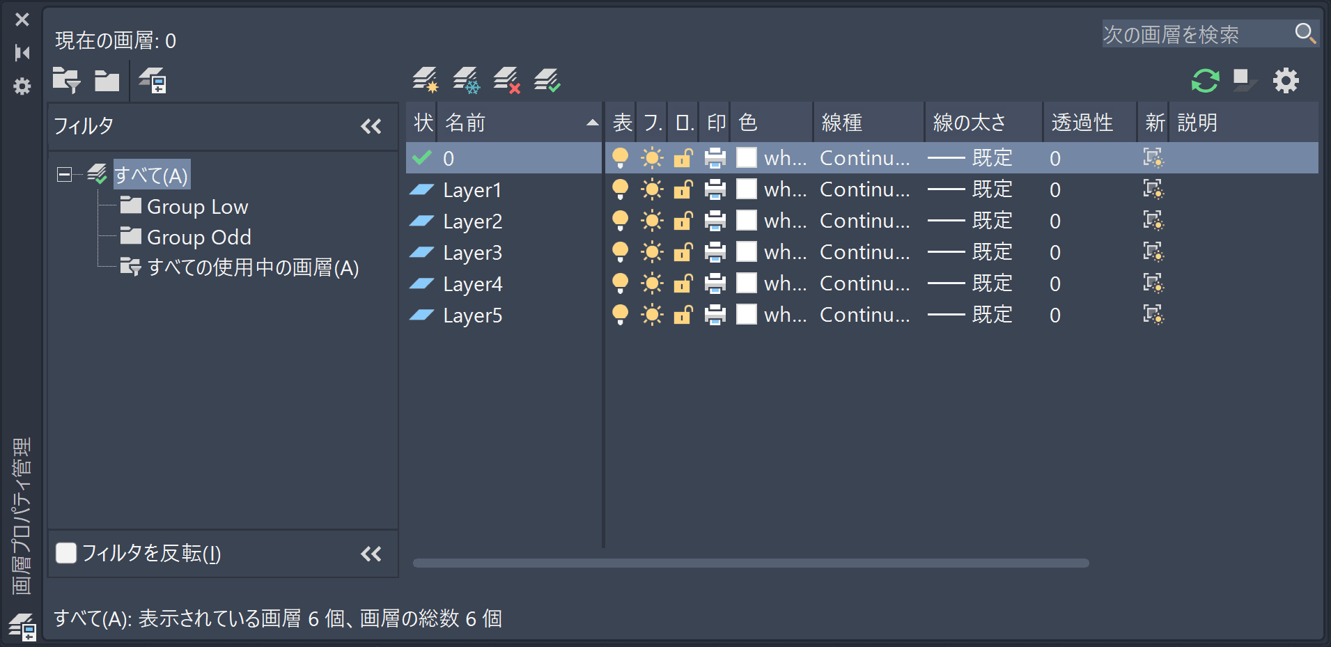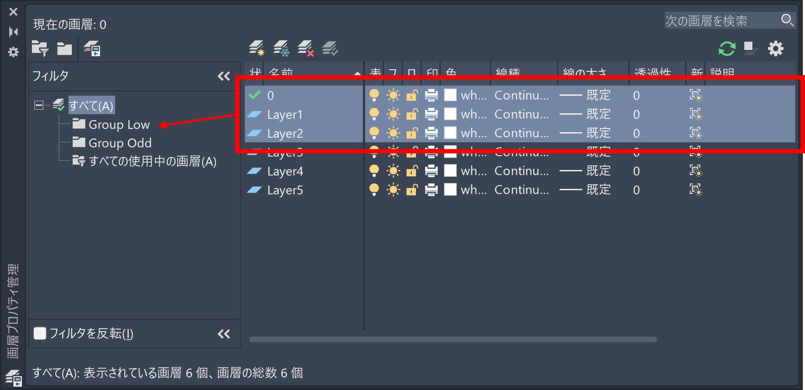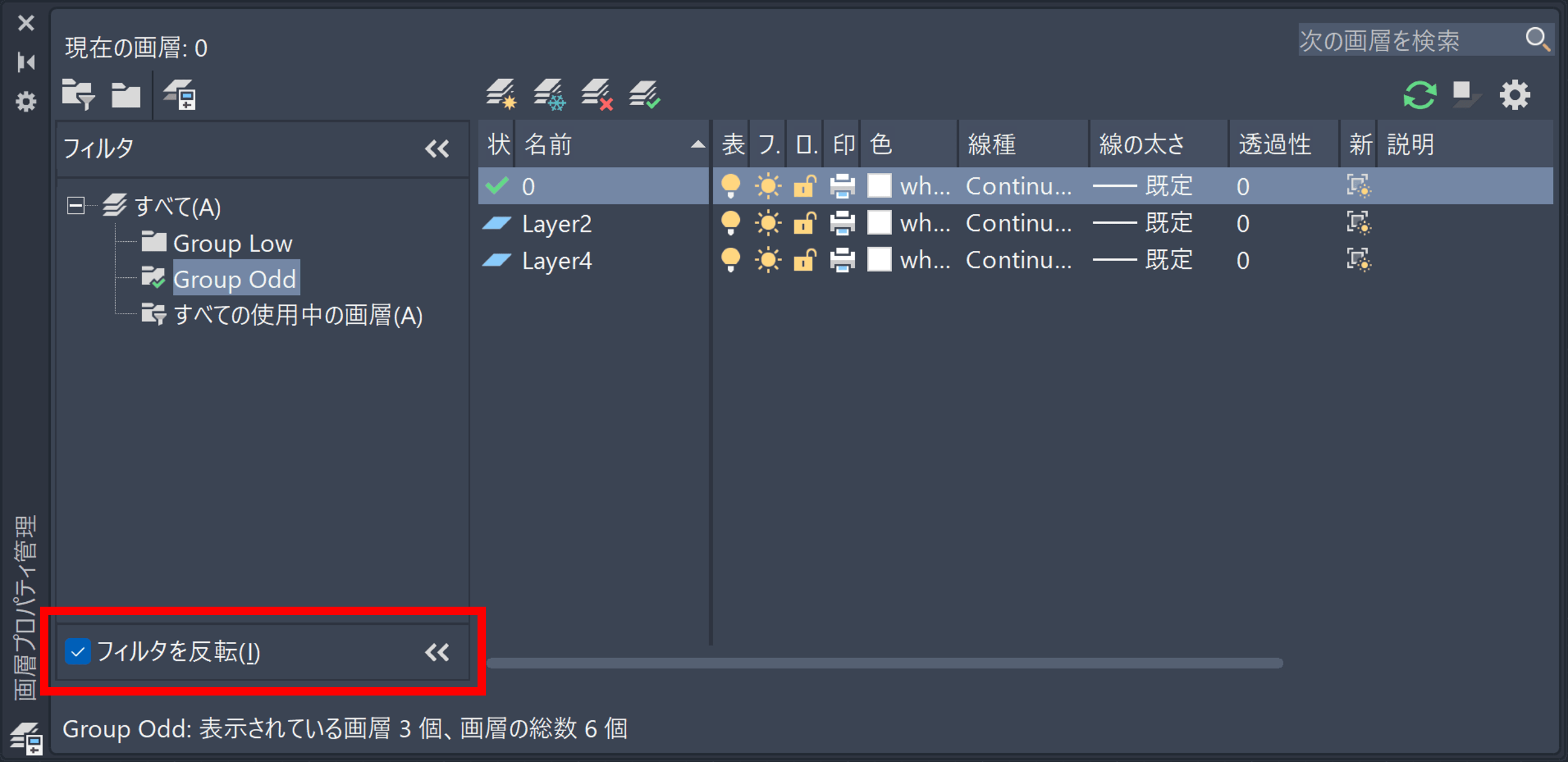「Group Odd」をクリックすると、[画層プロパティ管理]や画層ドロップダウン リストには、「Group Odd」画層グループに含まれる画層のみが表示されます(現在の画層「0」も含まれます)。