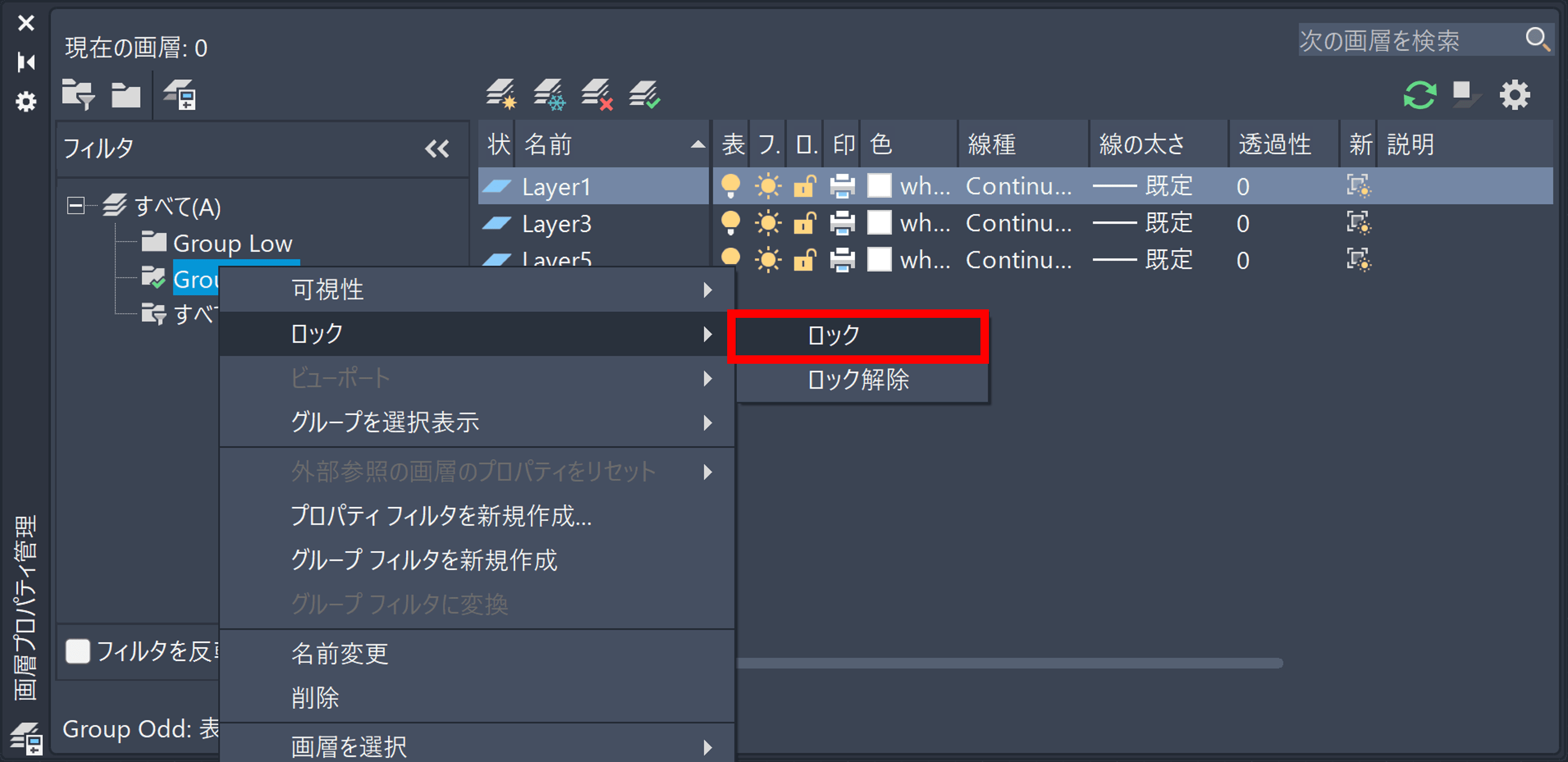 選択している画層グループを右クリックすると、そのグループ内のすべての画層のプロパティを一括で変更することもできます。たとえば下の例では、「Group Odd」画層グループ内のすべての画層をまとめてロックしています。