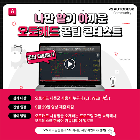 오토캐드 AutoCAD 사용자 여러분 안녕하세요. 오토캐드를 평소에 사용하면서 알게 된 꿀팁과 노하우가 있지 않으신가요?? 사용자 여러분의 인사이트를 다른 사용자들과 나누고, 멋진 상품도 받아갈 수 있는 콘테스트가 진행됩니다 "나만 알기 아까운 오토캐드 꿀팁