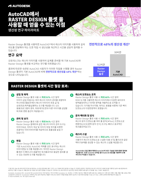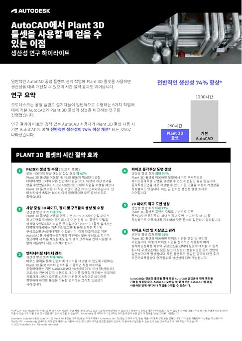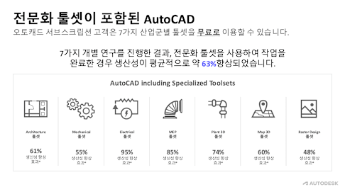 AutoCAD의 모든 기능에 더해, 7가지 산업군별 툴셋과 고급 자동화 기능을 사용할 수 있습니다. (툴셋: 건축, 기계, 전기, MEP, Plant 3D, Raster Design)