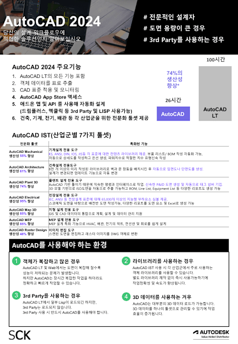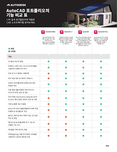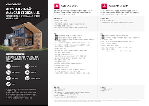 AutoCAD와 AutoCAD LT 최신 버전의 기능 비교 자료입니다. AutoCAD 패밀리 내 제품 선택이 고민인 분들이라면 살펴보세요!